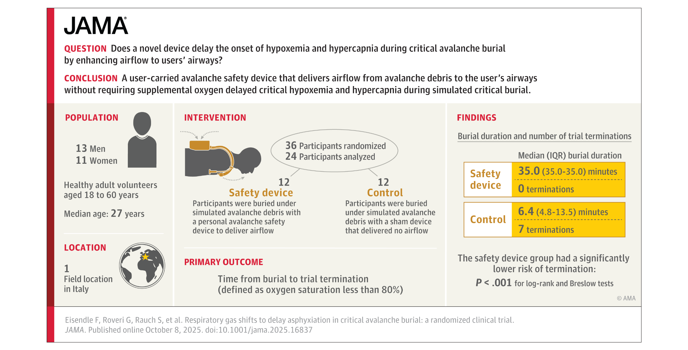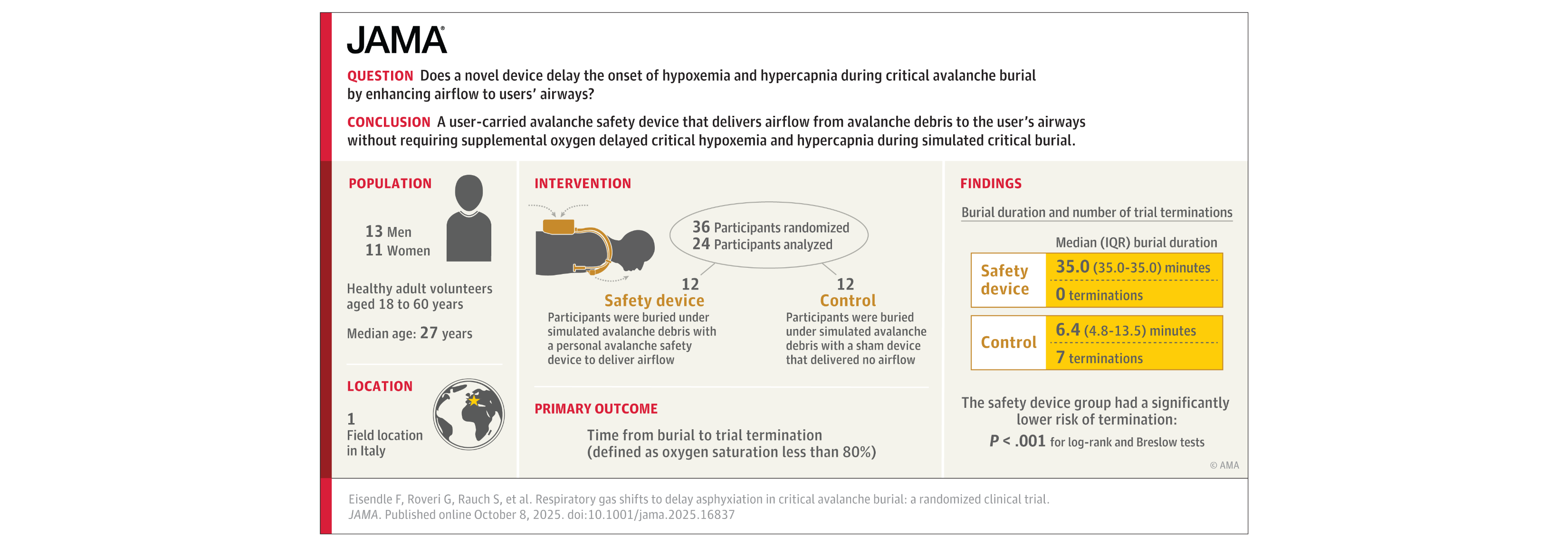 “Prevention remains the most important tool for saving lives in the mountains. However, our clinical trial shows that this device is highly effective in prolonging survival under the snow and can gain valuable time for rescue operations,” stated Giacomo Strapazzon and Frederik Eisendle, Head authors of the study.